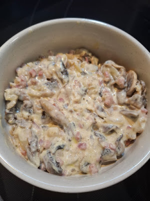 Tenía unos champiñones en la nevera que me habían sobrado de hacer un carpaccio, un tetrabrick de nata del día anterior que ya sabéis que no se puede dejar más de un 1 ó 2 días abierto en la nevera; y me apetecía algo diferente, sin mucha complicación. Salió esto.